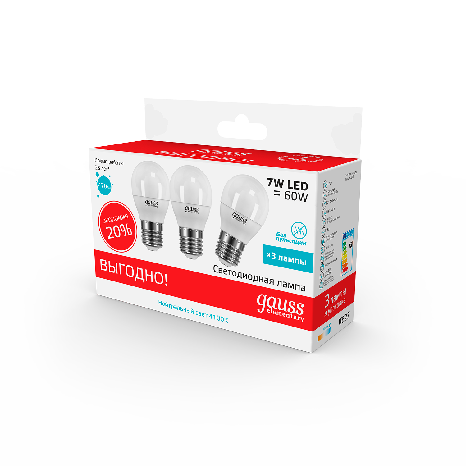 Gauss Лампа Elementary Шар 7W 470lm 4100K E27 (3 лампы в упаковке) LED информация: