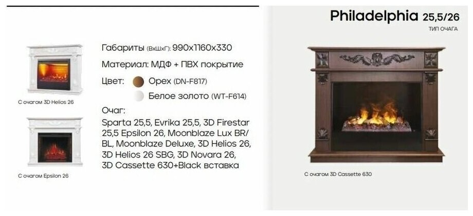 Камин RealFlame Philadelphia 25,5/26 DN с очагом 3D Cassette 630 Black Panel информация: