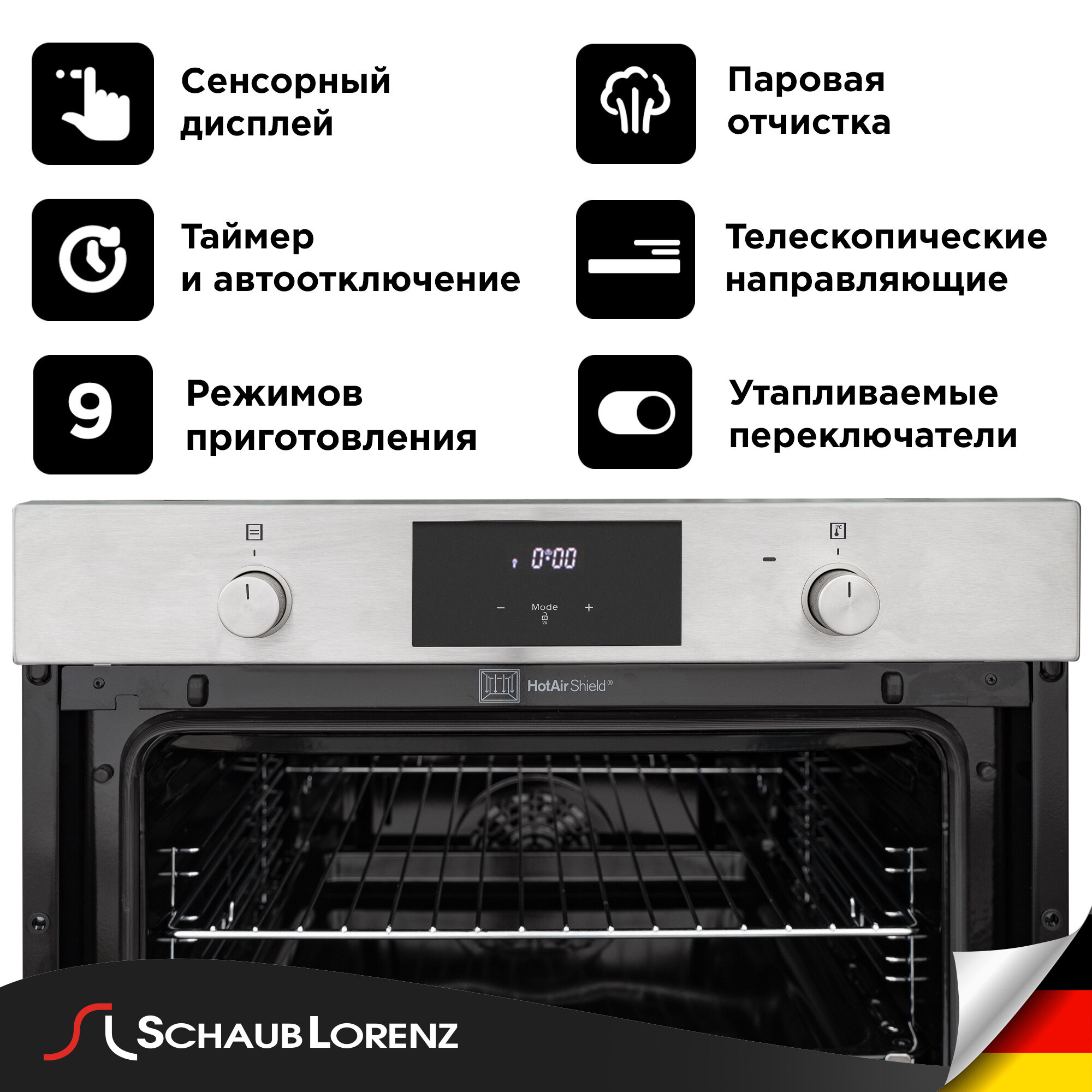 Электрический духовой шкаф встраиваемый Schaub Lorenz SLB EE6933, нержавеющая сталь, 75 л, конвекция, гриль, пицца.