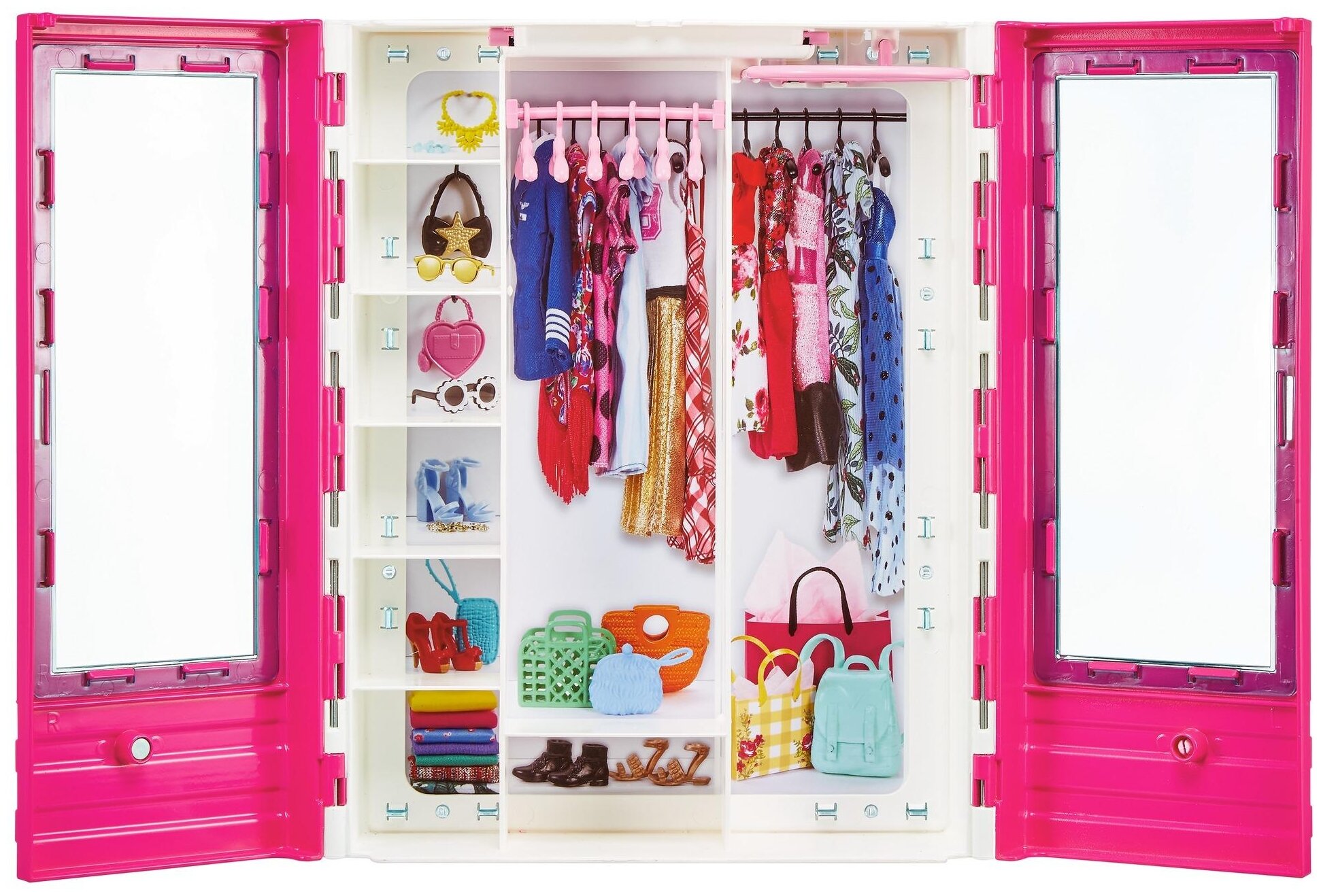 | Дополнительная информация | дополнительная одежда не входит в комплект; в гардеробе есть выдвижная вешалка и множество пространства для хранения нарядов и аксессуаров; на крыше гардероба есть ручка для переноски; двухместный розовый кабриолет оснащен ремнями безопасности и поворотными колесами |