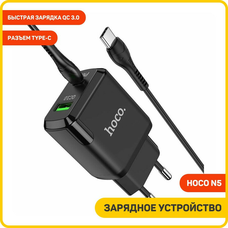 Сетевое зарядное устройство (СЗУ) Hoco N5 (USB/Type-C) + кабель Type-C-Type-C, 3 А, черный информация: