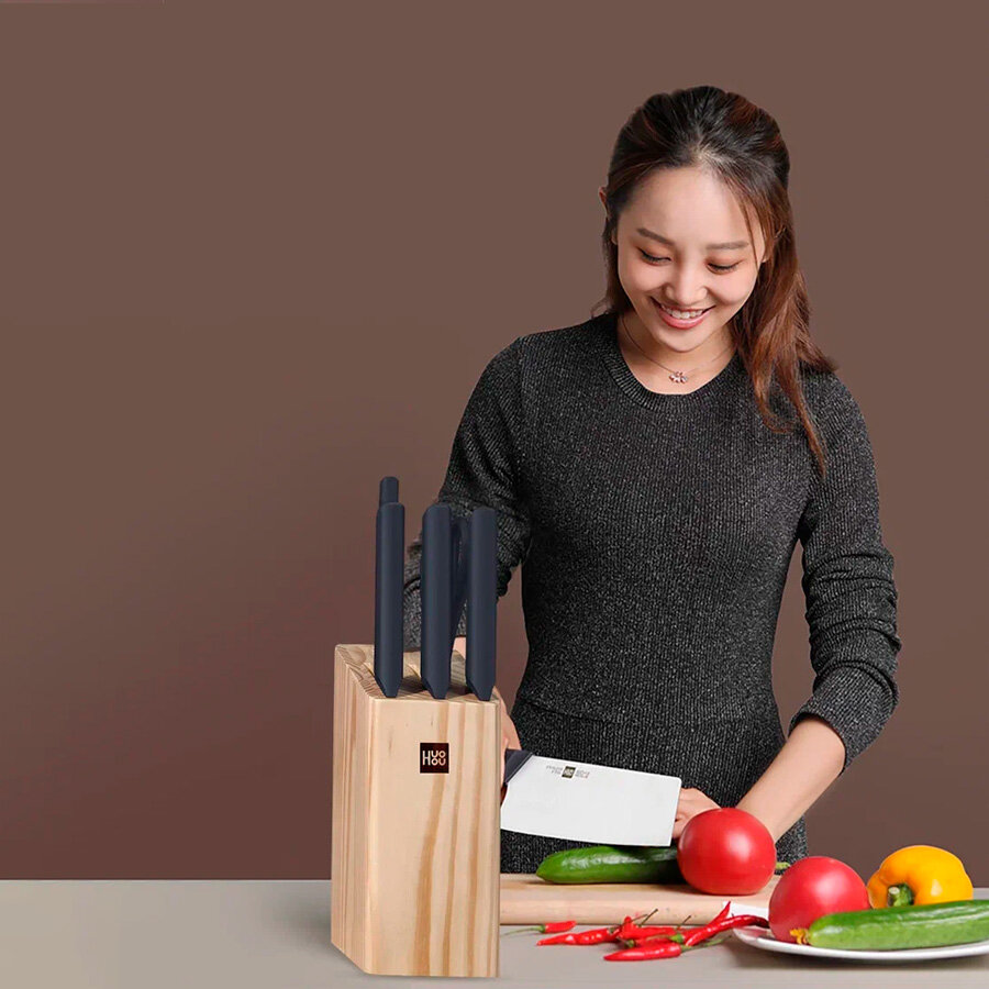 Набор стальных ножей (4 ножа + ножницы + деревянная подставка из сосны) Xiaomi (Mi) HuoHou 6-Piece Kitchen Knife Set Lite , RUS черный