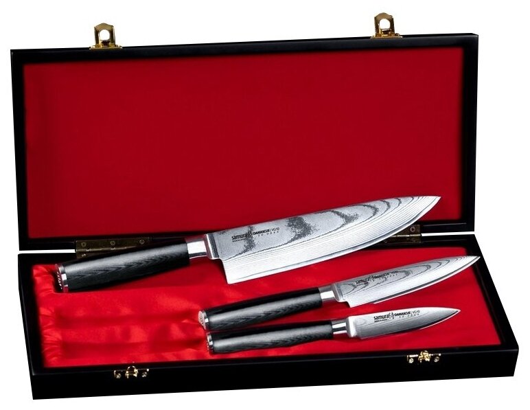 Отзывы на Набор ножей для кухни дамасских Samura Damascus / комплект из 3 кухонных ножей (овощной, универсальный, Шеф) в подарочном кейсе SD-0220