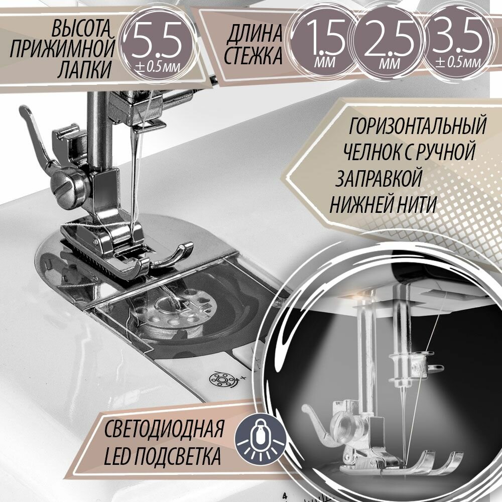 | Дополнительная информация | обработка петли для пуговицы; автоматическая намотка нити; регулируемая скорость шитья; регулируемое натяжение нити; встроенная LED подсветка; прямой и обратный ход при шитье; удобная ручка для переноса; нитеобрезатель |
