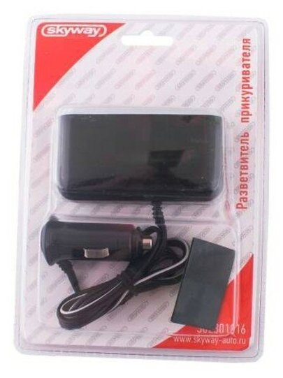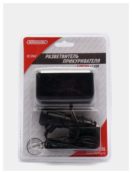 Разветвитель прикуривателя SKYWAY 2 гнезда + USB черный, предохранитель 10 А, USB 1 A S02301016