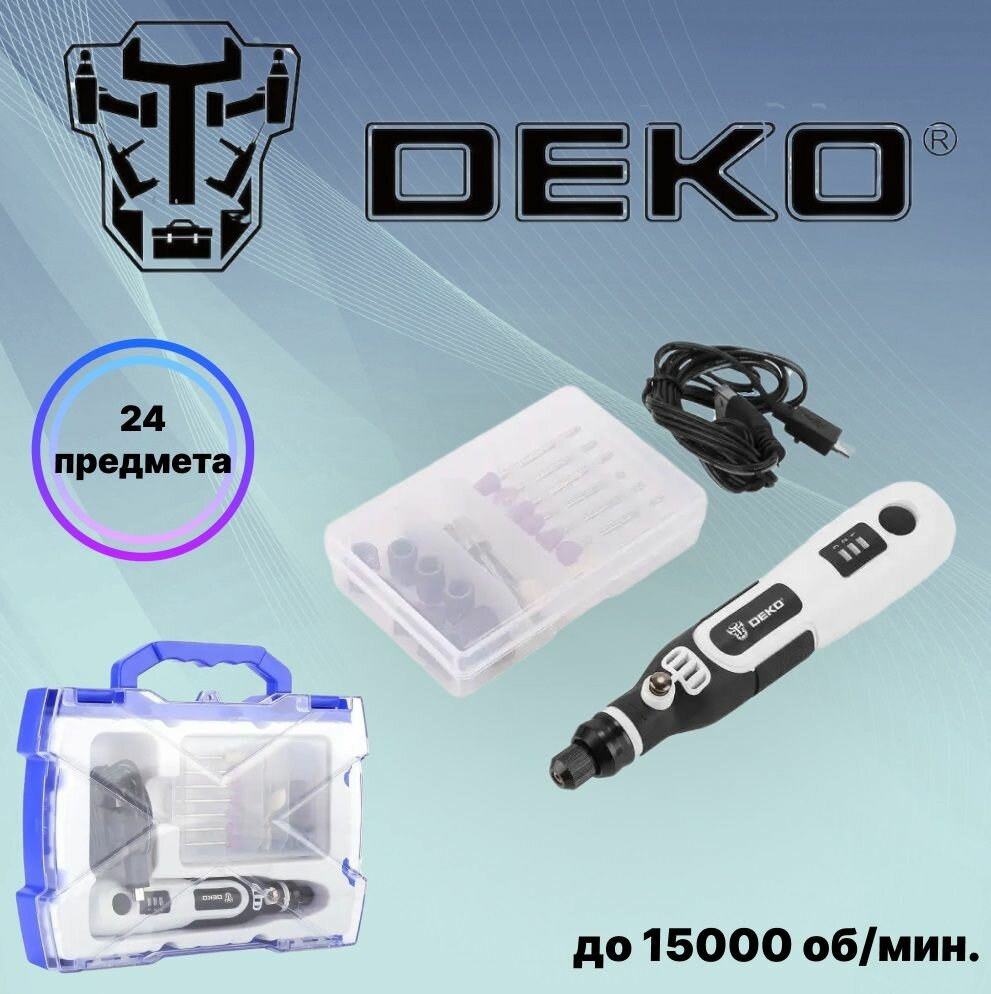 10 цен на Гравер аккумуляторный DEKO DKRT3.6-Li SET, 3.6 В, 24 аксессуара, цанги 1.6/2,4 мм, кейс