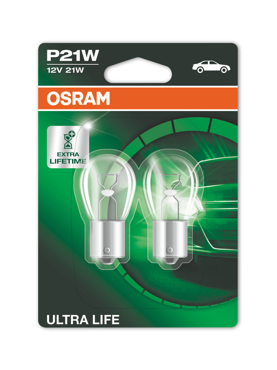 OSRAM 7506ULT-02B ламп накаливания блистер P21W 12V 21W BA15S ULTRA LIFE (в 3 раза увеличен срок службы по сравнению со стандартной лампой)