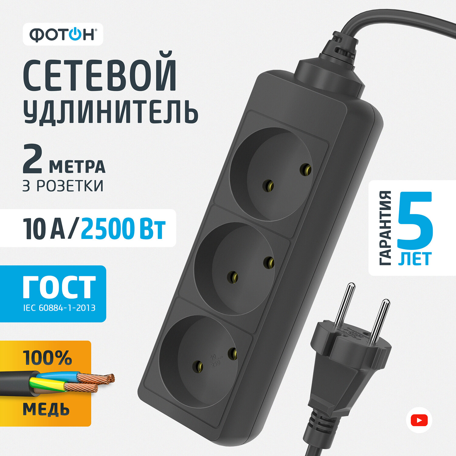 10 цен на Удлинитель сетевой для розетки, удлинитель для гирлянды фотон 10А 2м 3 розетки черный, ГОСТ