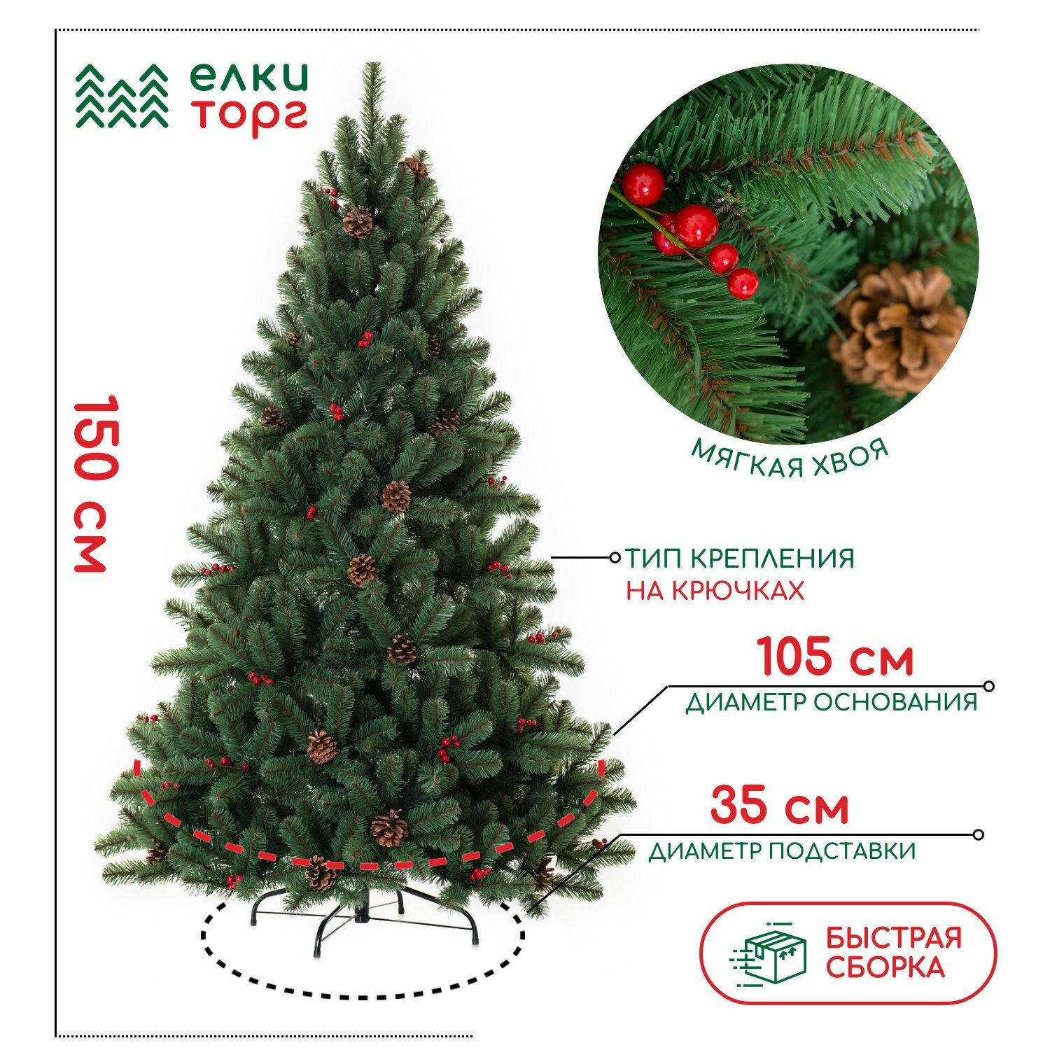 Елка Елкиторг 210 см, 963 ветки, шишки, ягоды