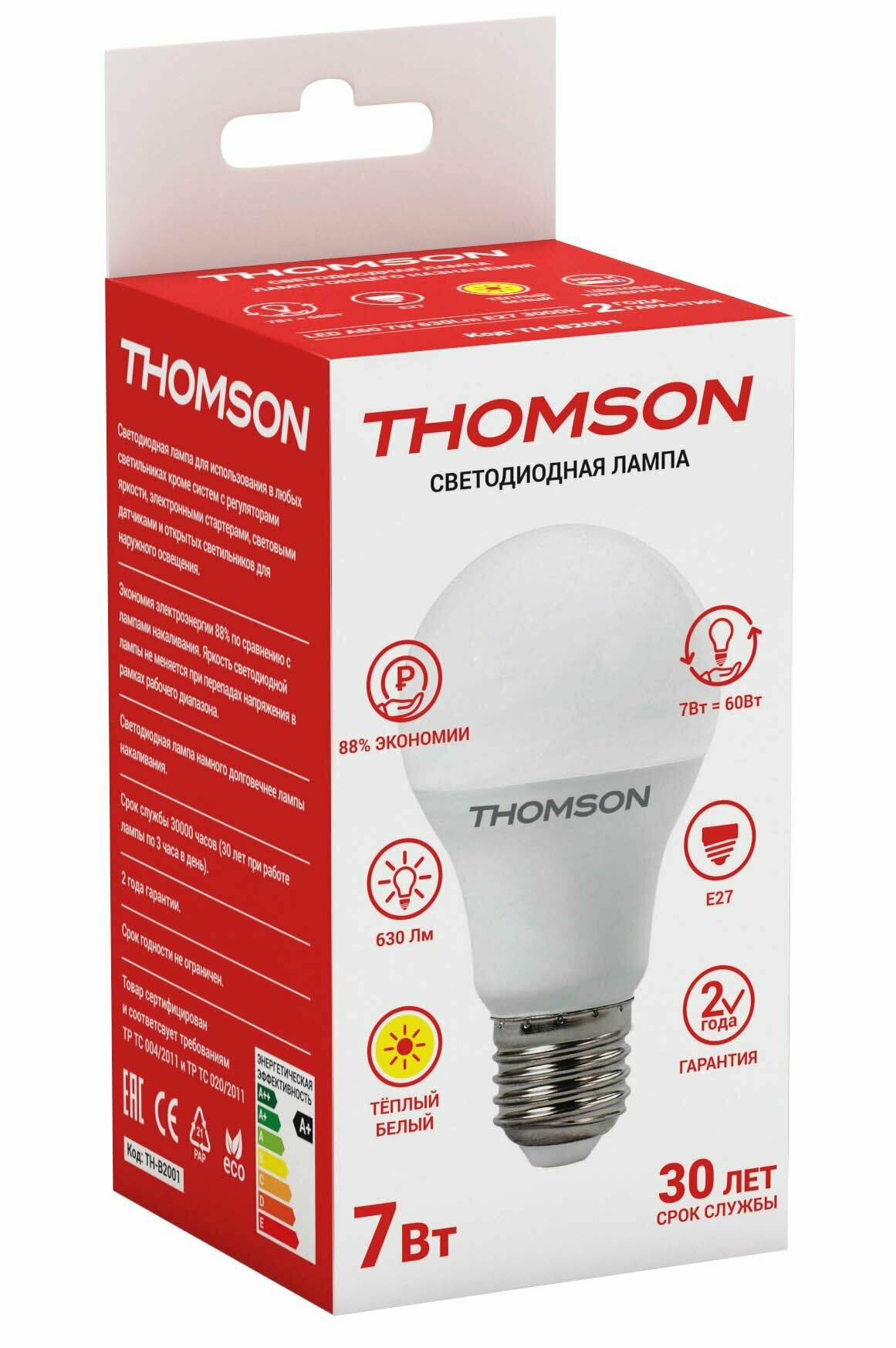 Лампа светодиодная Thomson TH-B2001, E27, A60, 7 Вт, 3000 К