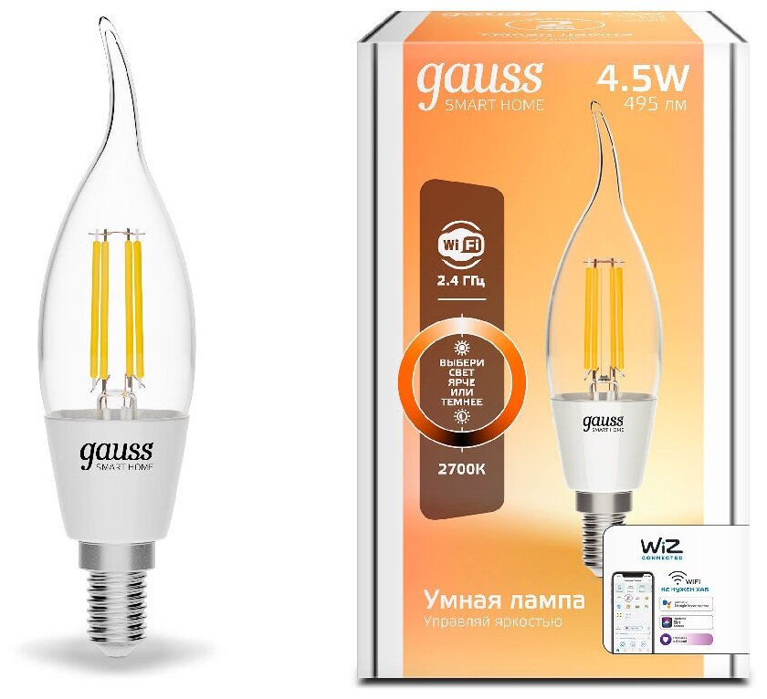 Умная Wi-fi филаментная лампочка Gauss, Smart Light DIM E14 CF35 4,5 Вт 2700-6500K, диммируемая, управление голосом/смартфоном 1260112