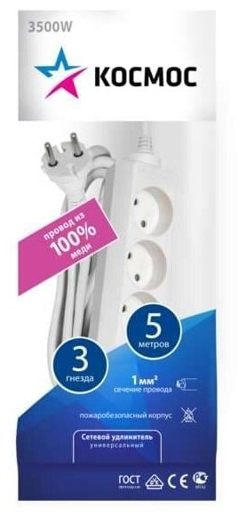 Отзывы на Удлинитель 3х5м без заземл. 16А IP20 ПВС 2х1 Космос YKsm5m-3g(K) космос YKSM5M-3G(K) (1 шт.)