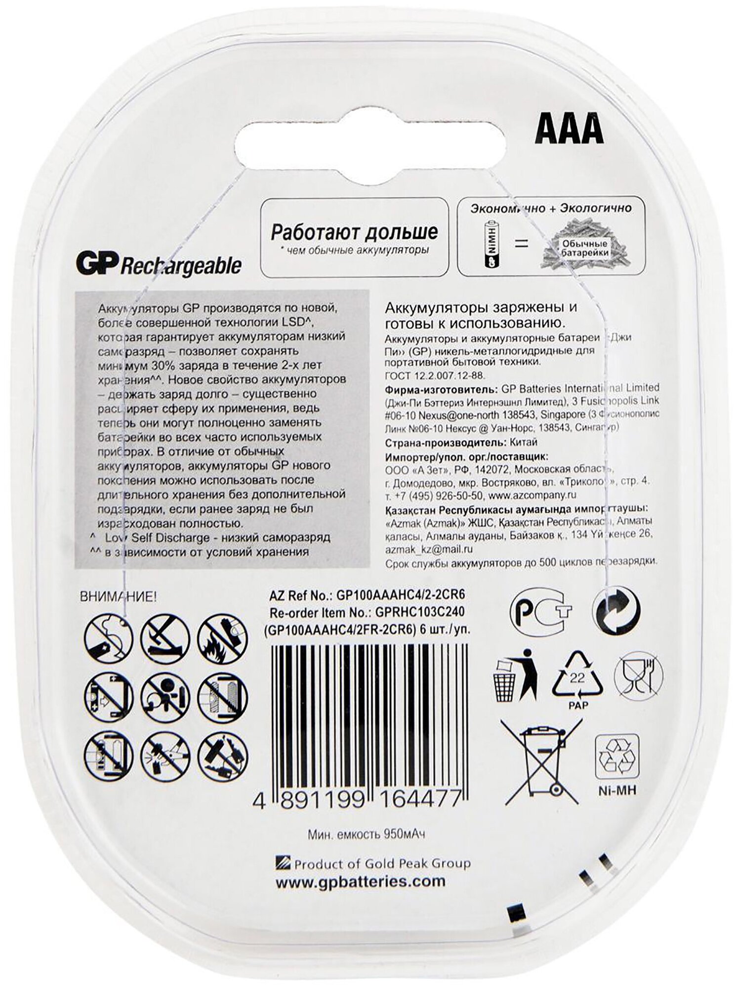 Аккумуляторная батарейка GP AAA (HR03) Ni-Mh 1000 мАч 6 шт. информация: