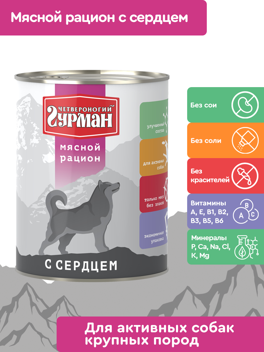 Четвероногий Гурман Консервы для собак Мясной рацион с сердцем 104113007 0,85 кг 54685 (6 шт) информация: