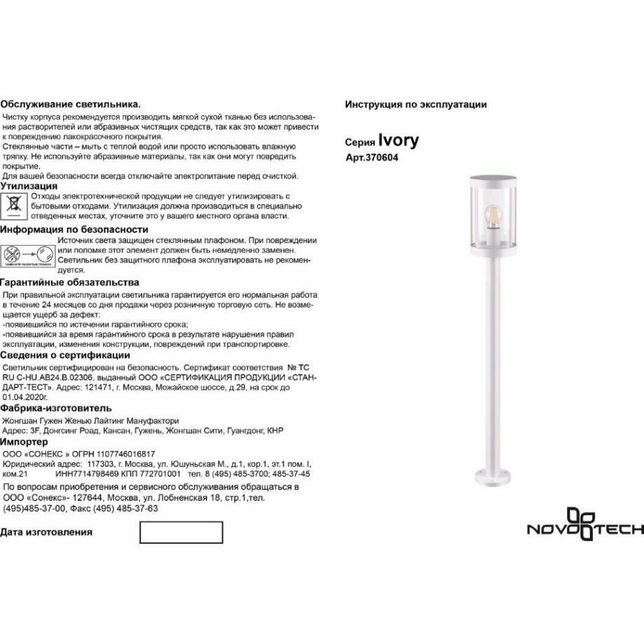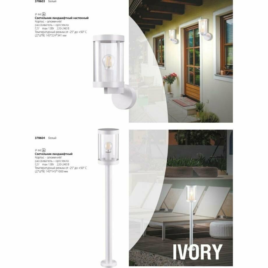 Novotech ландшафтный светильник Ivory 370604, E27, 13 Вт, цвет арматуры: белый, цвет плафона бесцветный информация: