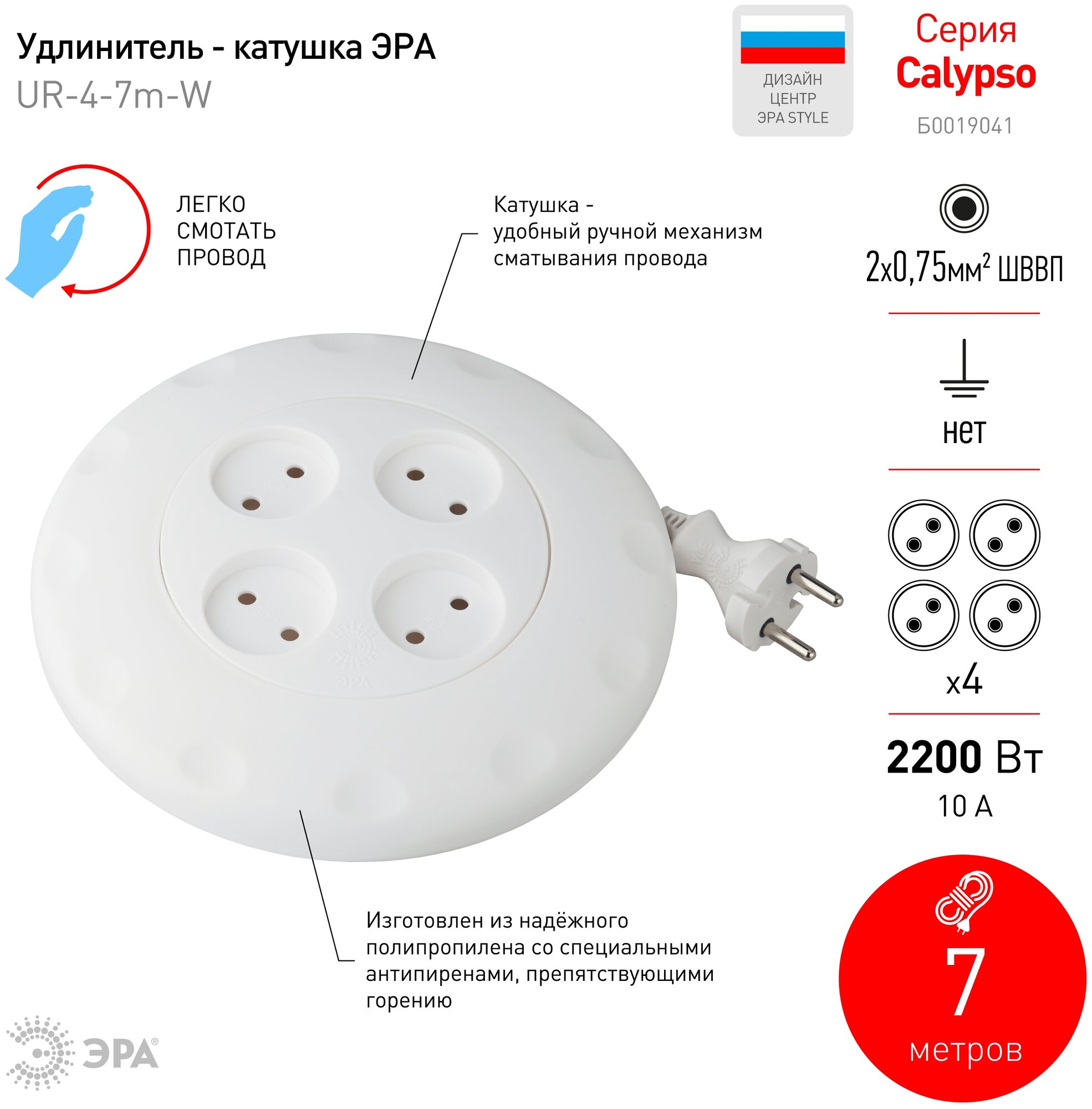 ЭРА Б0019041 Удлинитель-рулетка UR-4-7m-W Calypso без заземления белый 4 гнезда 7 м полипропилен, 2 .