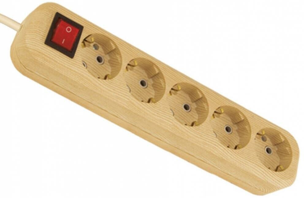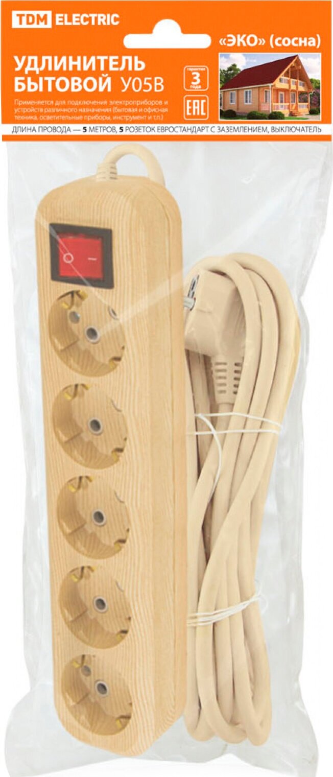 10 цен на Удлинитель бытовой У05В выключатель, 5 гнезд, 5метров,2П+3, ПВС 3х1мм2 «Эко» (сосна) 16А/250В TDM
