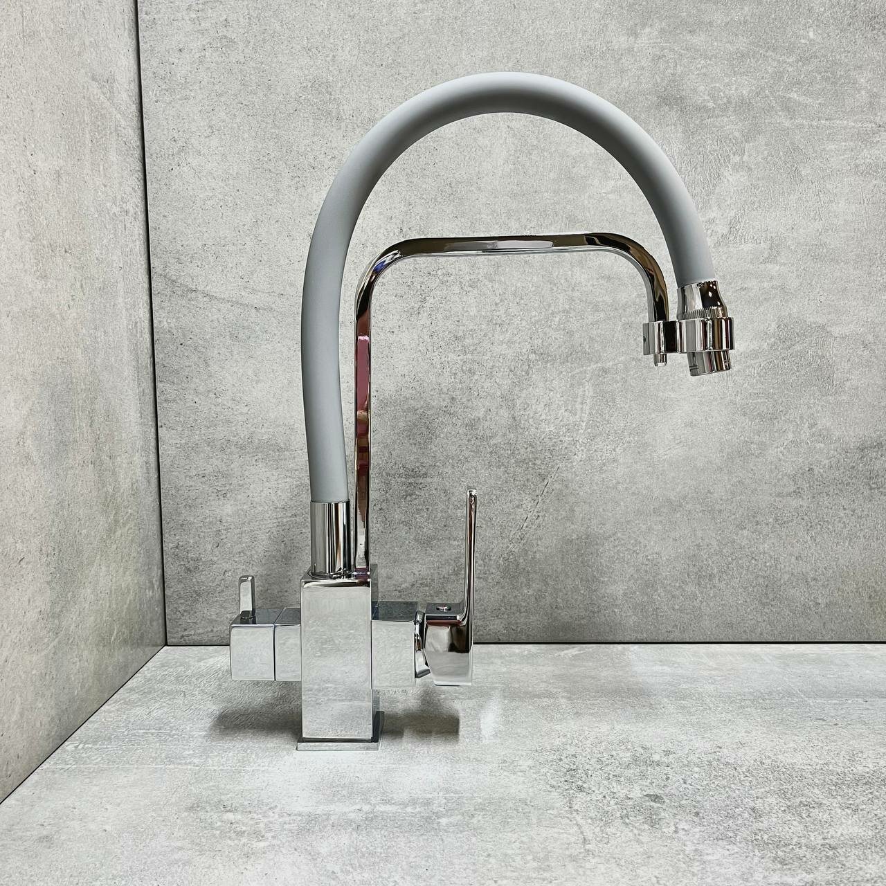 Смеситель для кухни HAIBA с гибким силиконовым поворотным изливом, с подключением фильтра питьевой воды, с корпусом из латуни, держатель излива, цвет хром/серый, монокомандный, аэратор, универсальный