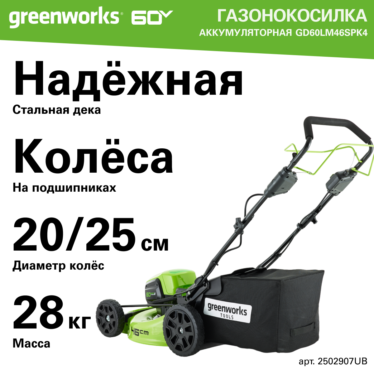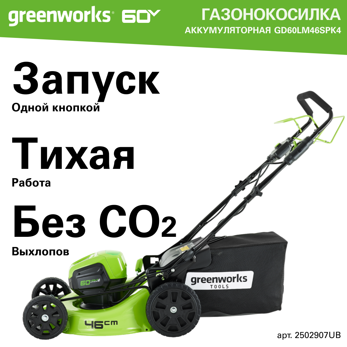Газонокосилка аккумуляторная Greenworks Арт. 2502907UB, 60V, 46 см, самоходная, бесщеточная, с 1хАКБ 4 Ач. и ЗУ информация: