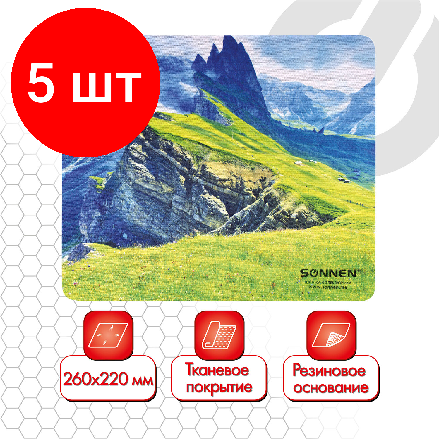 10 цен на Комплект 5 шт, Коврик для мыши SONNEN "MOUNTAINS", резина + ткань, 260х220х3 мм, 513298