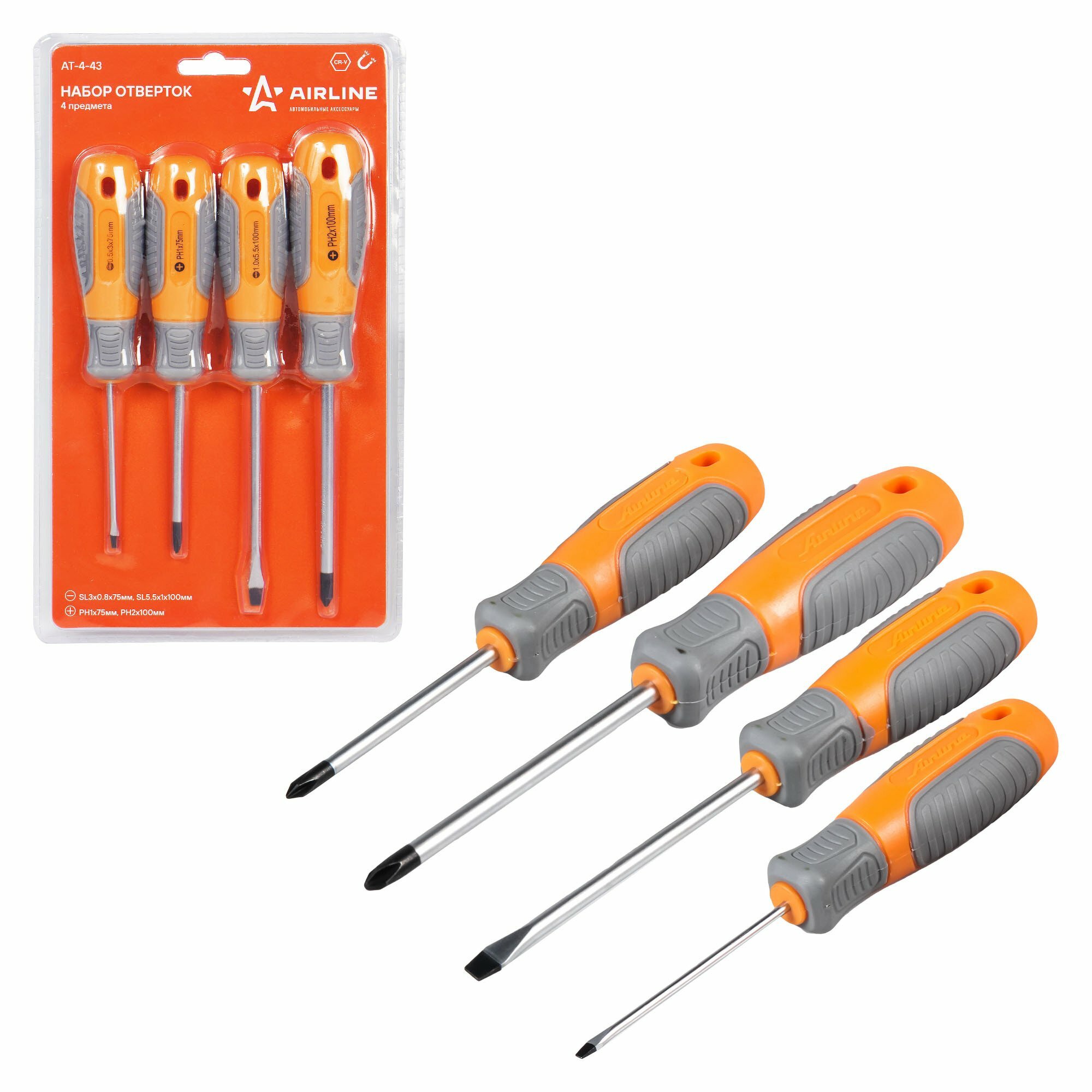 AIRLINE AT443 Набор отверток 4 предмета (SL3*0.8*75мм,SL5.5*1*100мм,PH1*75мм, PH2*100мм) блистер (AT-4-43)