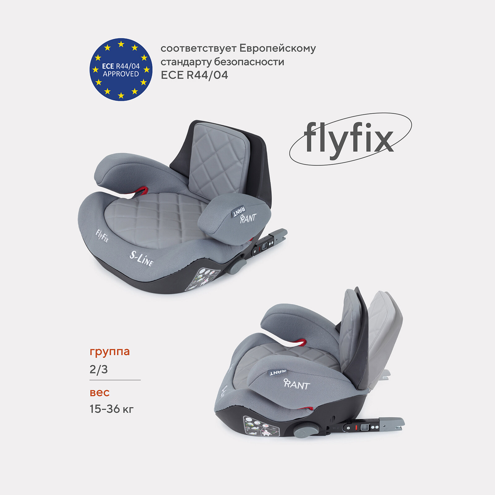 Автокресло детское Rant Flyfix группа 2/3 от 3 о 12 лет вес 15-36 кг рост 100-145 см серый информация: