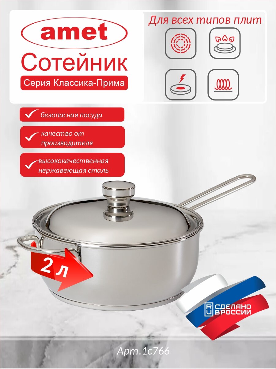Кастрюля-сотейник 20см амет Классика-Прима 1С-766, нерж.сталь, без покрытия, крышка металл, матовая