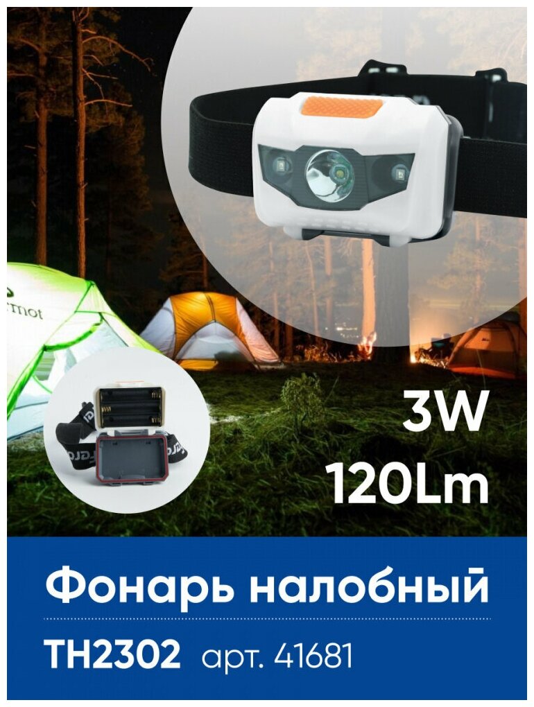 Фонарь налобный TH2302 на батарейках 3*AAA, 1LED+2RED IP44, пластик, FERON 41681 (1 шт.)