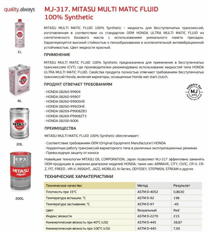 Отзывы на MITASU MJ-317-1 MITASU 1L масло трансмисионное MULTI MATIC FLUID\ 100% Synthetic, для системы CVT HONDA