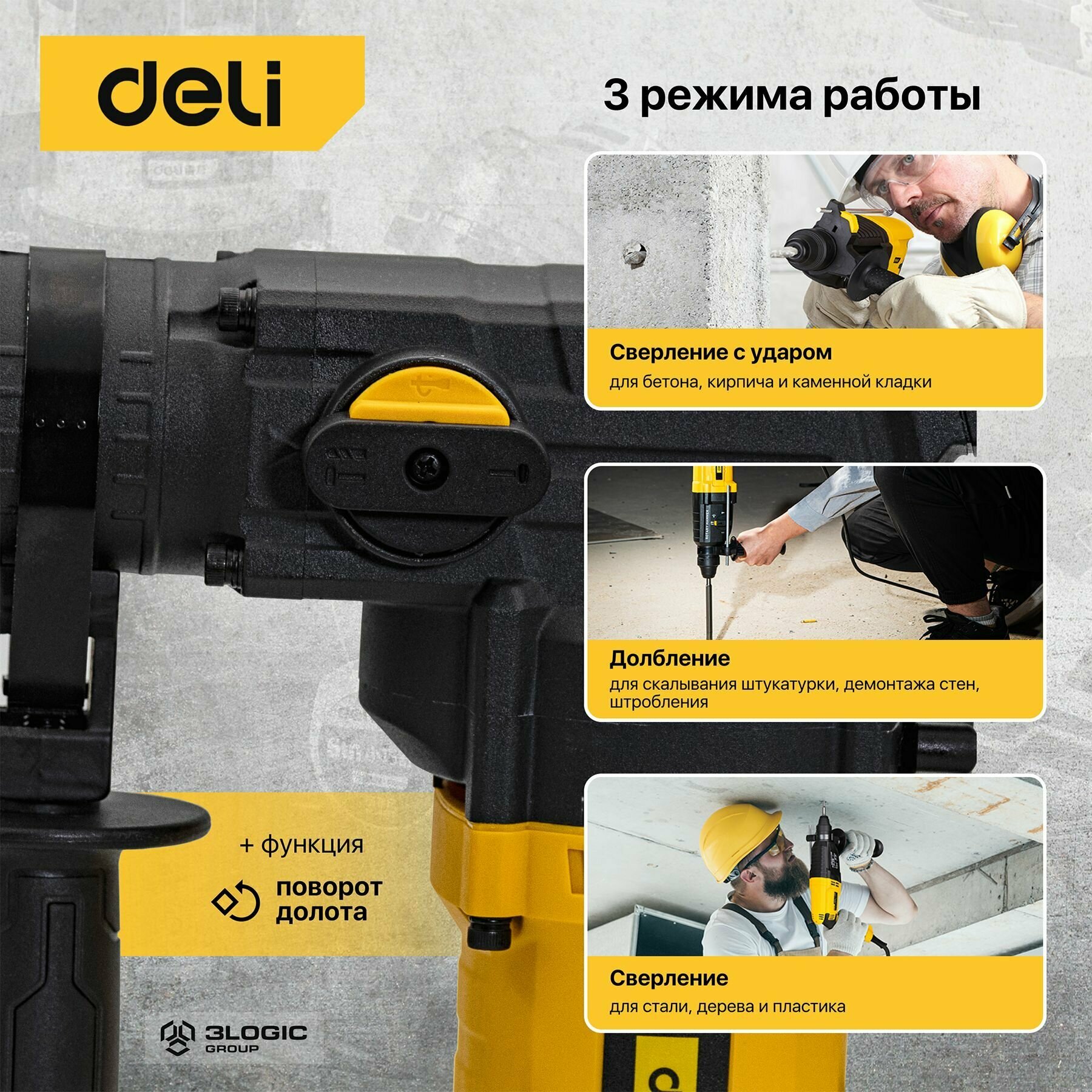 Отзывы на Перфоратор с вертикальным двигателем Deli DL-DC28-E1 (1050Вт, SDS+, 4300уд/мин, 900об/мин, кейс, в комплекте буры ф8/10/12, долото, пика)