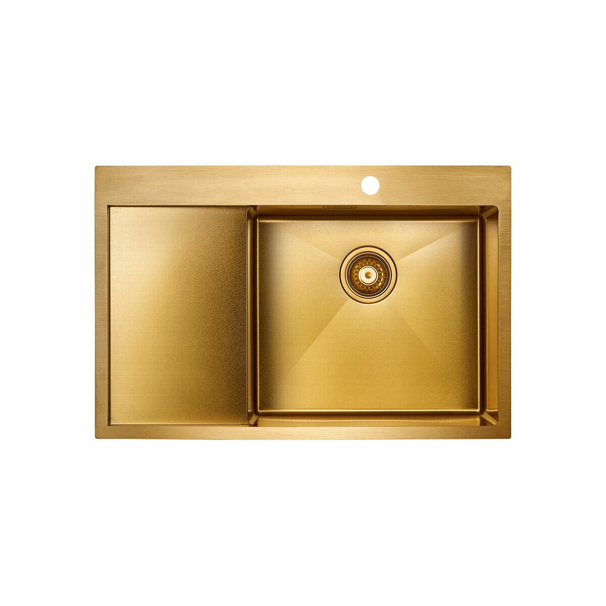 Кухонная мойка из нержавеющей стали AISI 304 Paulmark ELDE, 780х510 мм, мойка справа, PVD покрытие, отверстие под смеситель, врезная / вровень со столешницей, цвет брашированное золото, PM807851-BGR