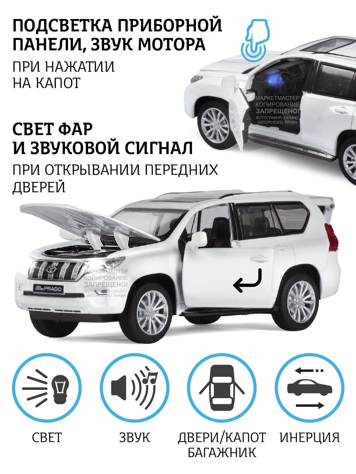 Машинка металлическая ТМ "Автопанорама", 1:32 Land Cruiser Prado, белый, инерция, свет, звук, открывающиеся двери