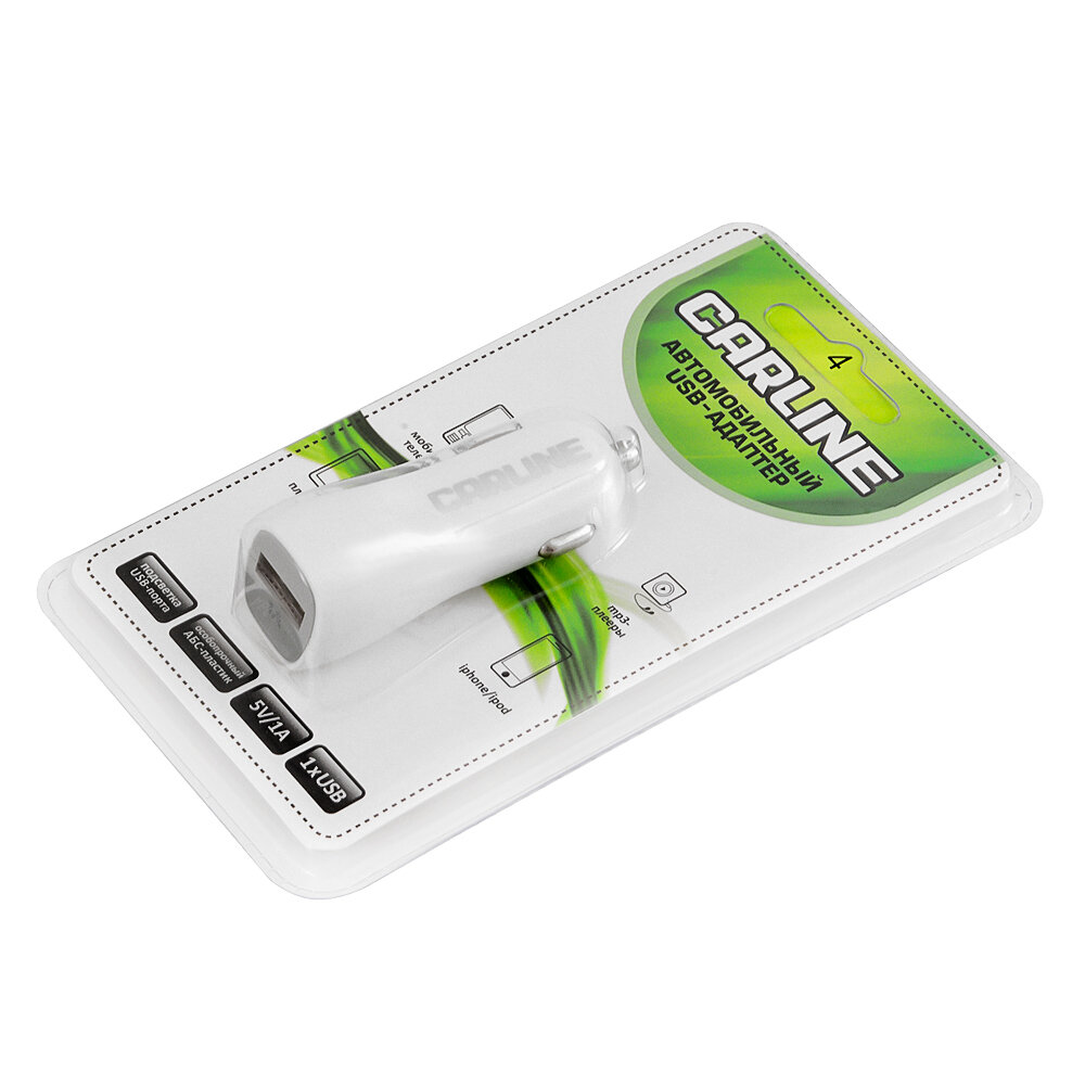 Адаптер автомобильный CARLINE 1хUSB 1А в прикуриватель 12/24В, цвет белый, упаковка запаянный блистер. 329 ₽