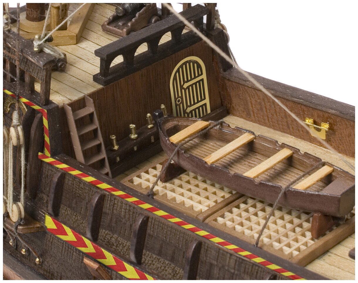 | Комплектация | традиционный наборный корпус из киля и шпангоутов с уже прорезанными пушечными портами / деревянные ограждения / трапы и решетки / фототравленные латунные двери / утки и окна / пушки на станках / шлюпка / металлические якоря / высокие мачт и горизонтальные реи / нити двух цветов и нескольких типоразмеров / блоки и юферсы из светлого дерева самшит / подшитые паруса / флаги и подставка |