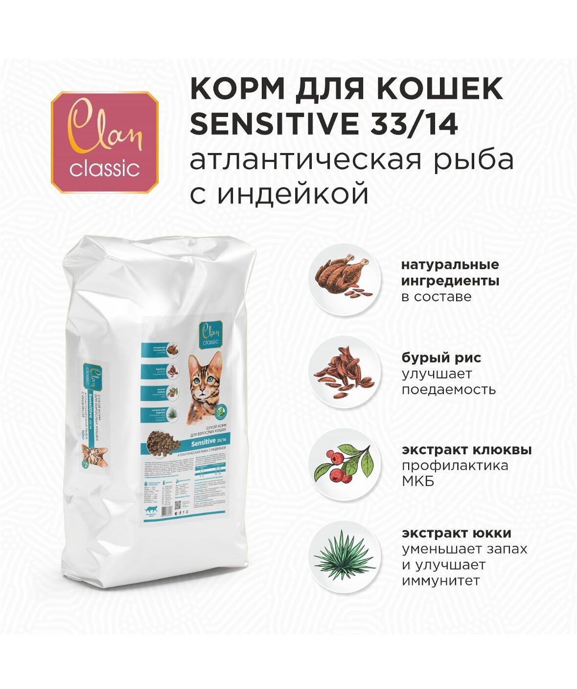 Сухой корм CLAN CLASSIC Sensitive-33/14 атлантическая рыба/индейка для кошек с чувствительным пищеварением 10кг информация: