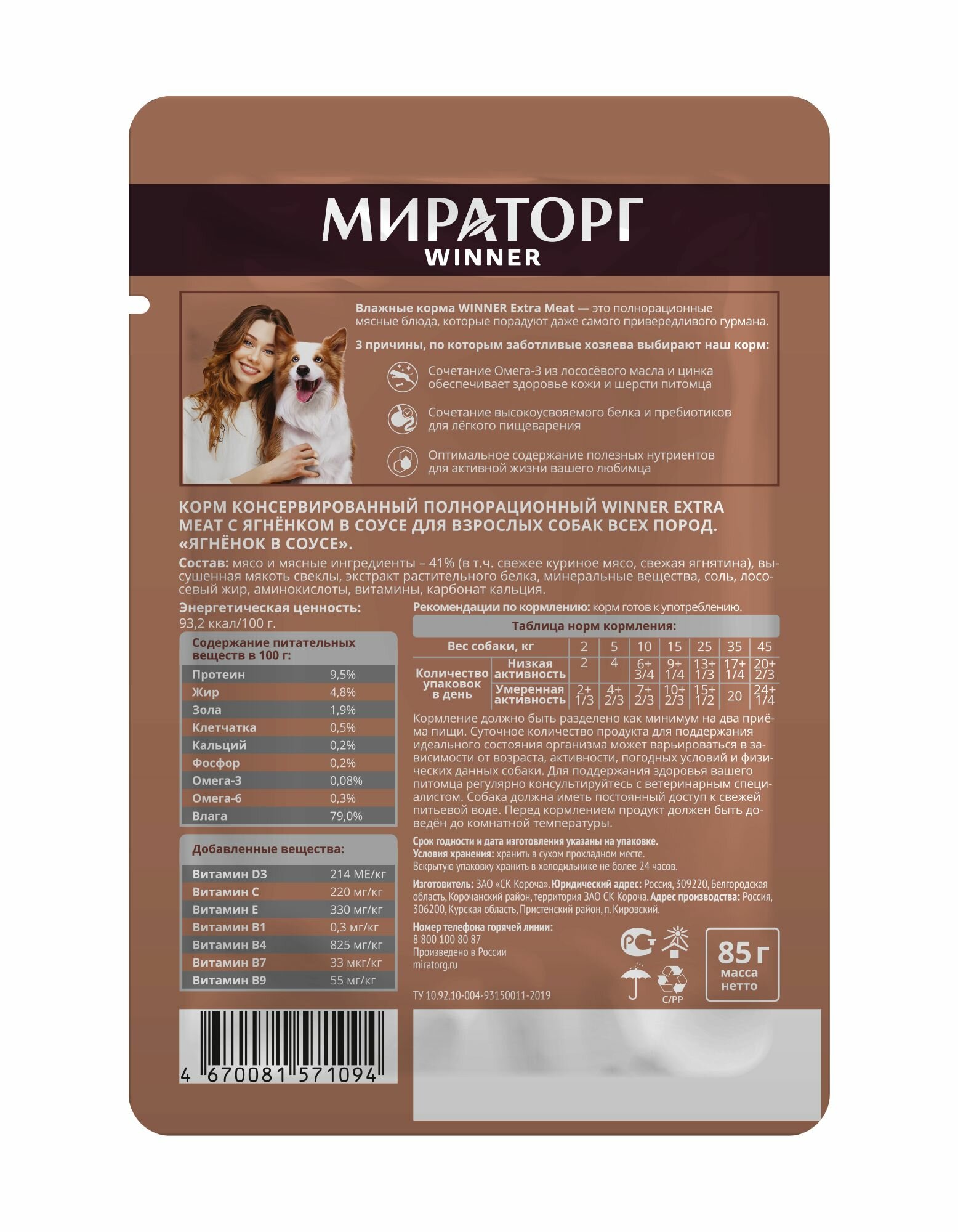 Корм влажный Winner пауч для собак Ягнёнок в соусе 85г 35% , 24 шт информация: