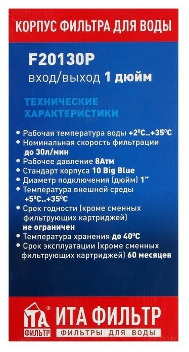 Корпус для фильтра ITA-30 10BB, 1", для холодной воды до 40°, 30 л/мин, без картриджа 7112539 информация: