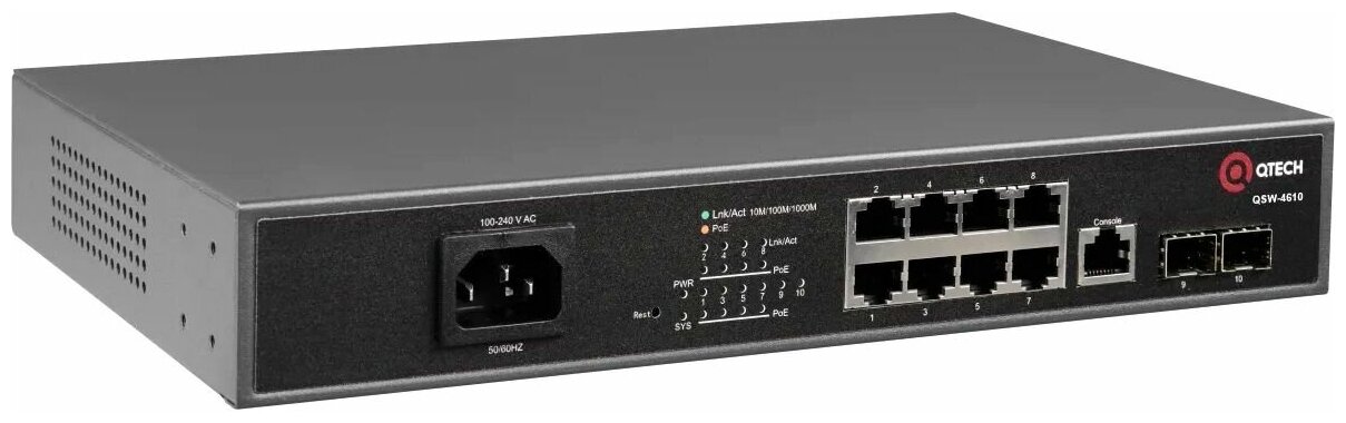 Управляемый коммутатор уровня L2+ с поддержкой PoE 802.3af/at, 8 портов 10/100/1000BASE-T, 2 порта 100/1000BASE-X SFP, 4K VLAN, 16K MAC адресов, консольный порт, встроенный БП разъем питания на передн (QSW-4610-10T-POE-AC)