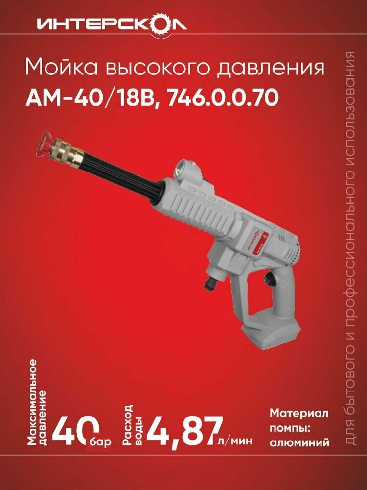 Аккумуляторная минимойка ИНТЕРСКОЛ АМ-40/18В 746.0.0.70, 40 бар, без АКБ и ЗУ