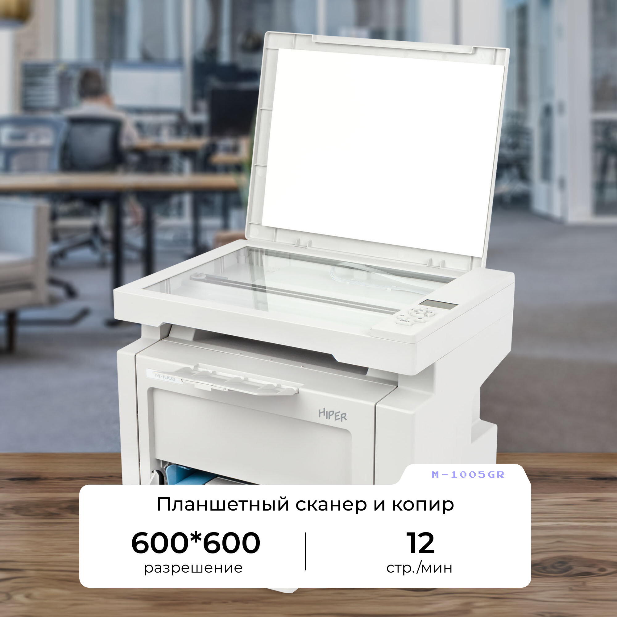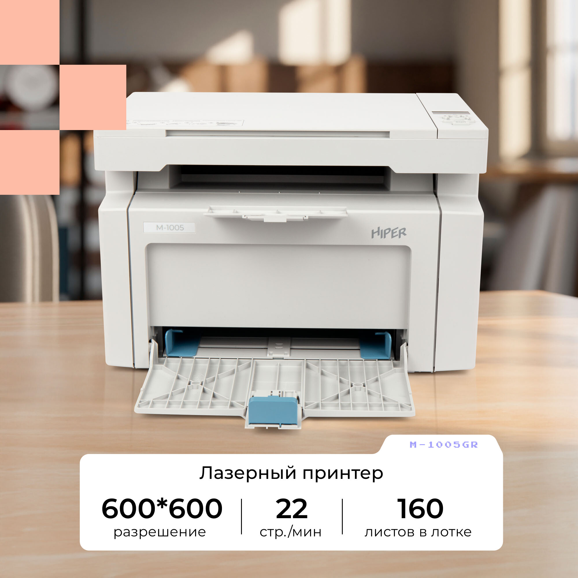 10 цен на МФУ, лаз ч/б печать Hiper M-1005, 600x600 dpi, А4, WiFi, серый