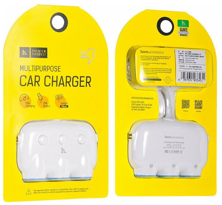 Автомобильный разветвитель прикуривателя Hoco C1 3in1 2USB (белый) информация: