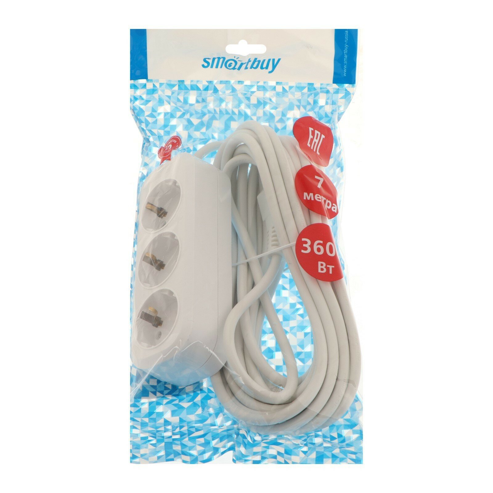 Удлинитель Smartbuy, 3 розетки, 7 м, 16 А, 3500 Вт, ПВС 3х1 мм2, с з/к, белый