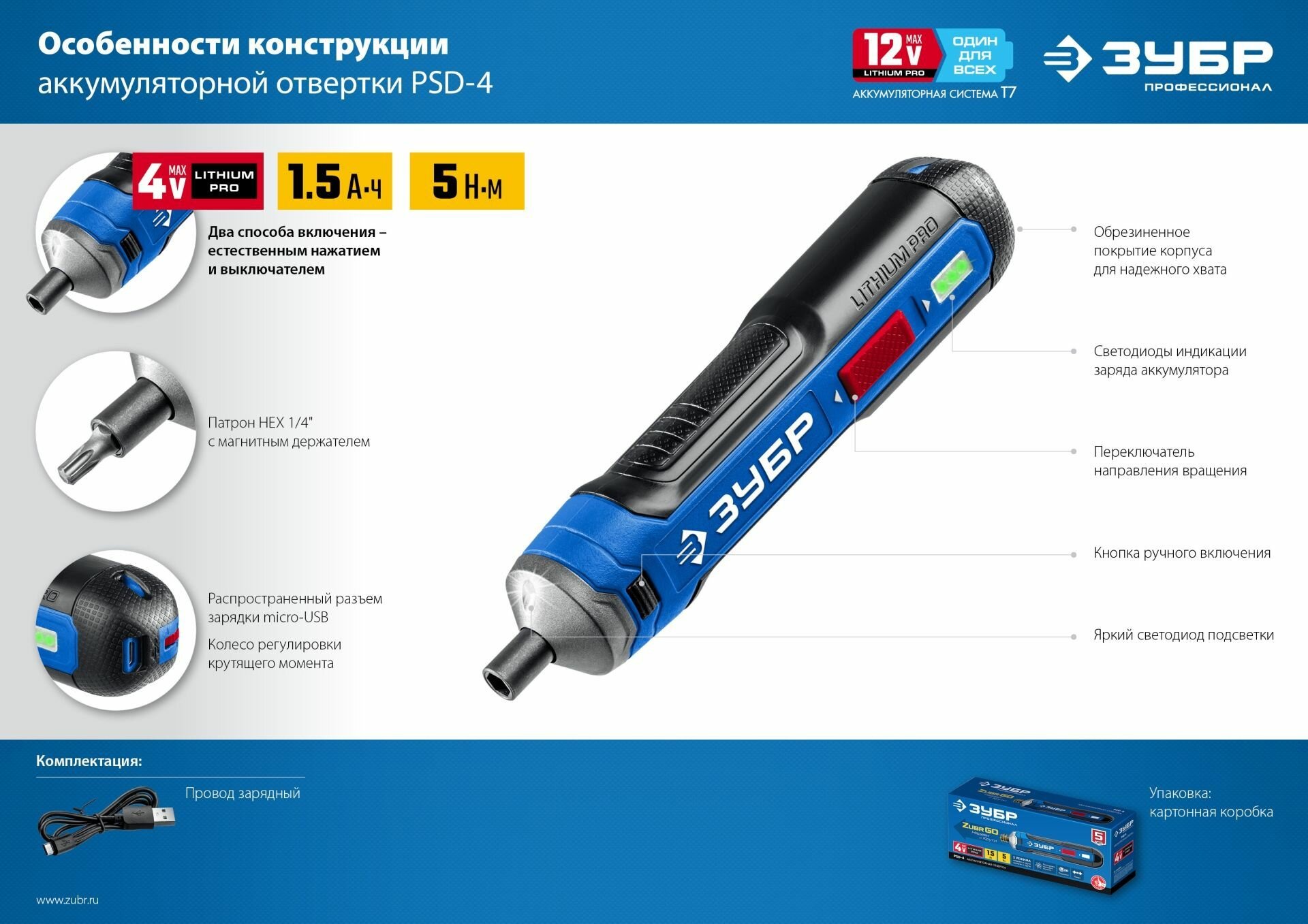 ЗУБР Профессионал PSD-4 отвертка аккумуляторная 4 Vmax, в коробке