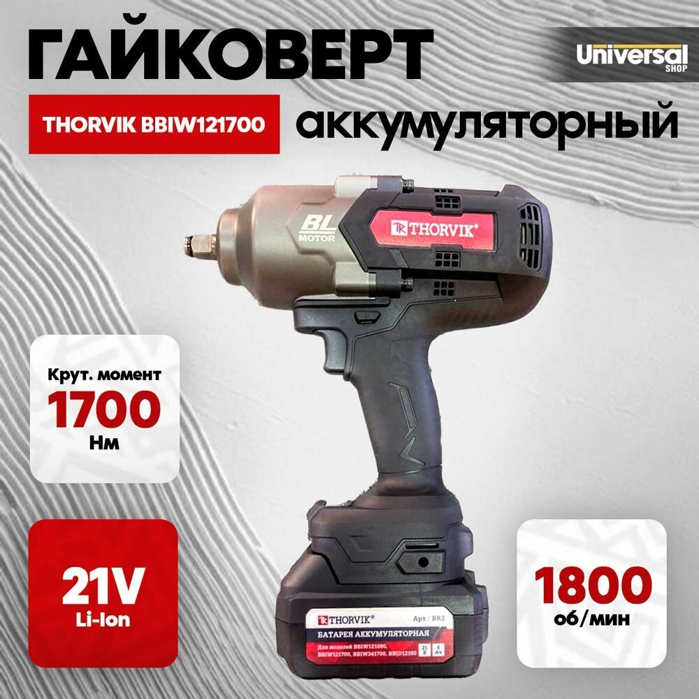 Аккумуляторный ударный гайковерт THORVIK BBIW121700 бесщеточный ,1/2DR, 21 В, 1700 Нм