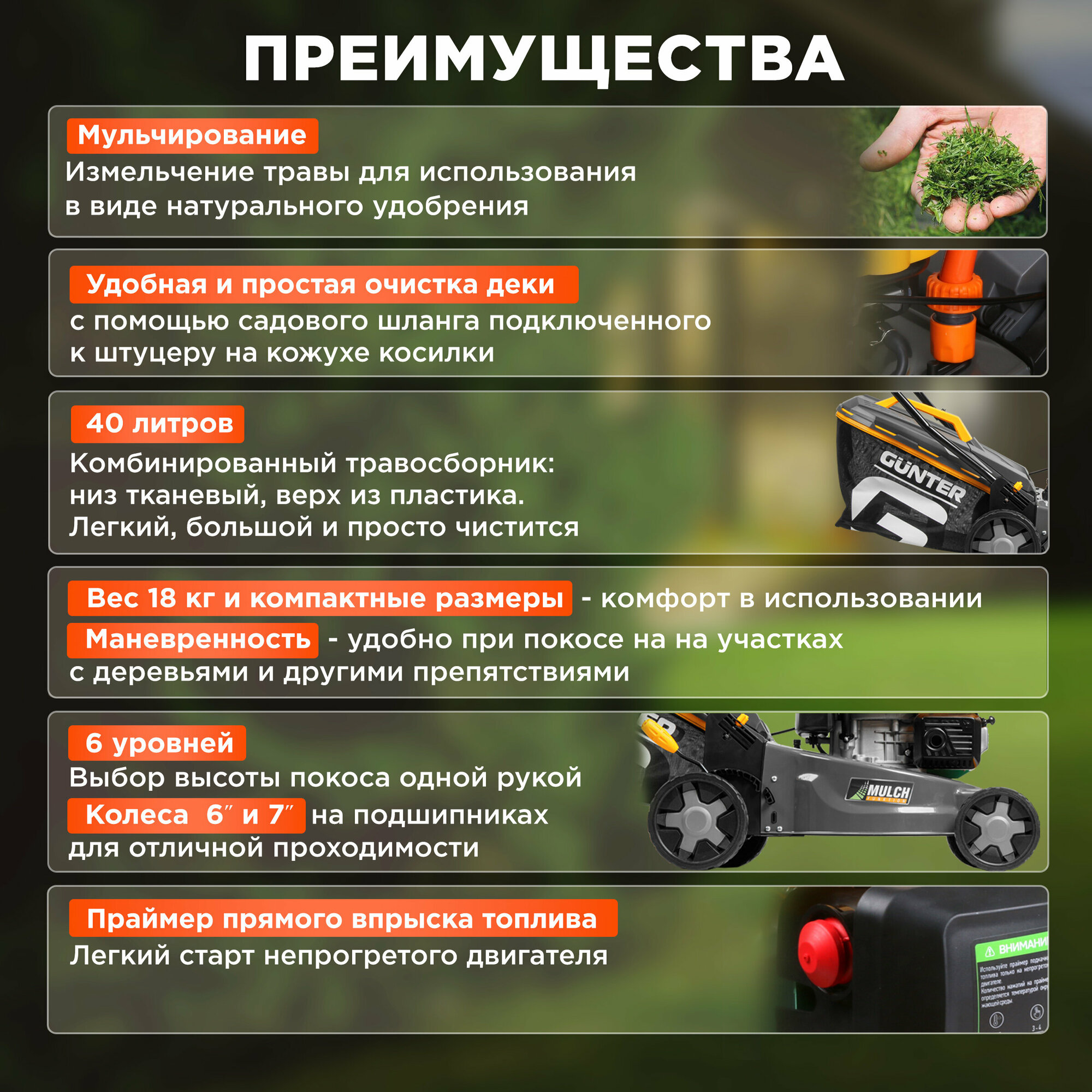 Газонокосилка бензиновая Gunter LMB-420 (4.0 л.с., шир. 42 см, ручной привод, стальн. корпус, травос информация: