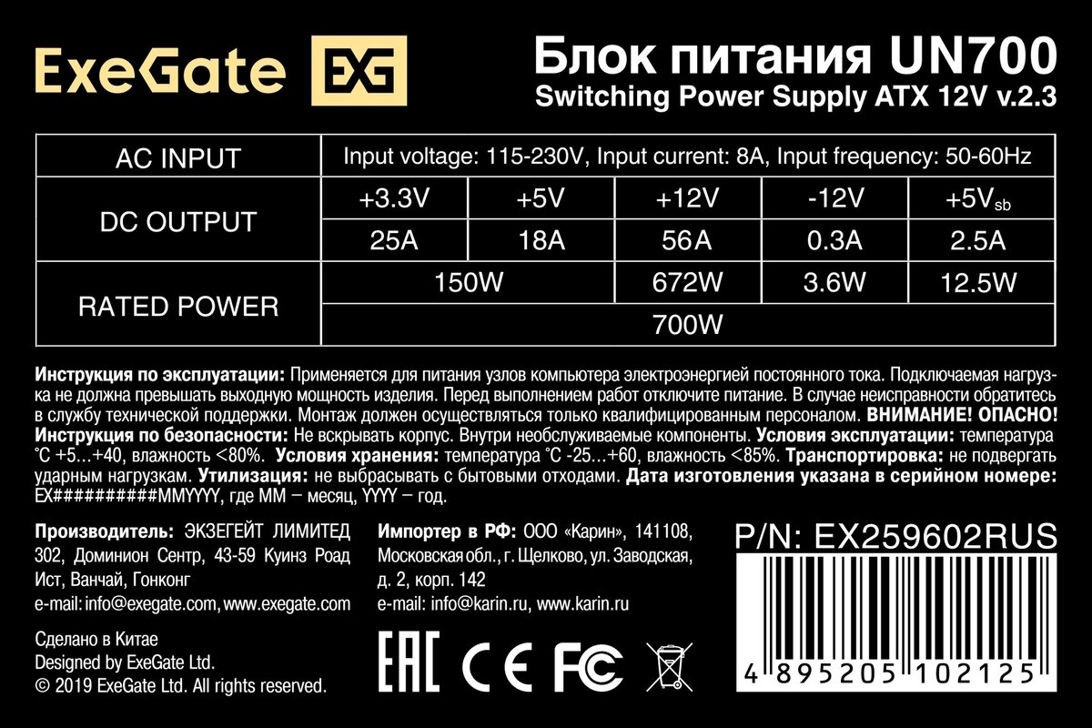 Блок питания 700W ExeGate UN700 (ATX, 12cm fan, 24pin, 2x(4+4)pin, 2xPCI-E, 5xSATA, 3xIDE) 3 022 ₽