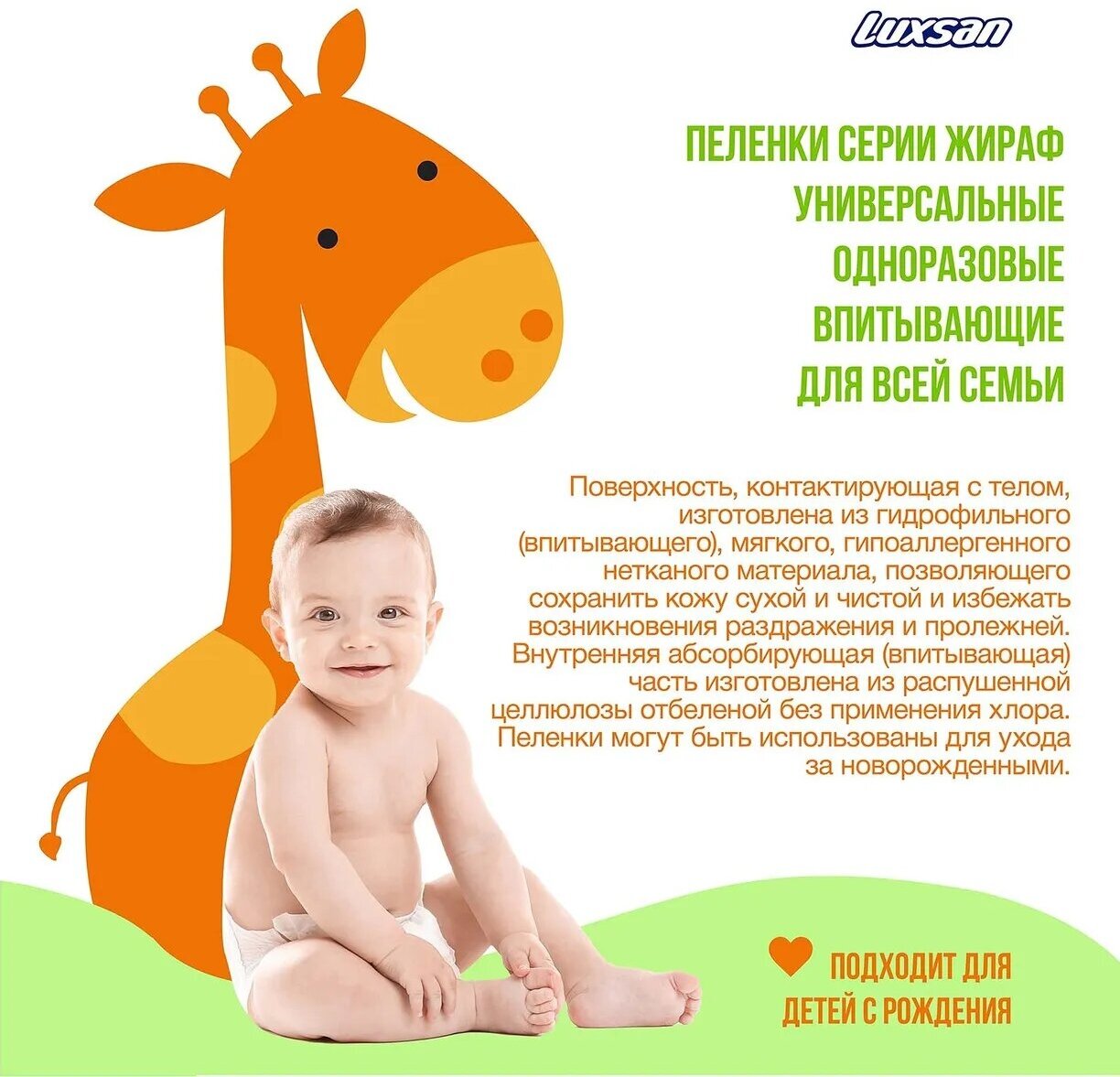 Пеленки одноразовые Luxsan Жираф, впитывающие 60 х 80 см, 30 шт упаковка.