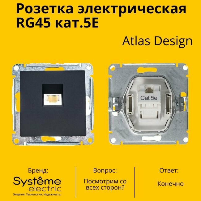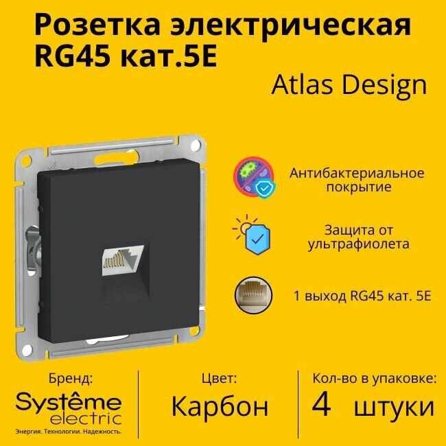 Розетка одноместная компьютерная электрическая Systeme Electric Atlas Design RJ45 кат.5E, Карбон ATN001083 - 4 шт. информация:
