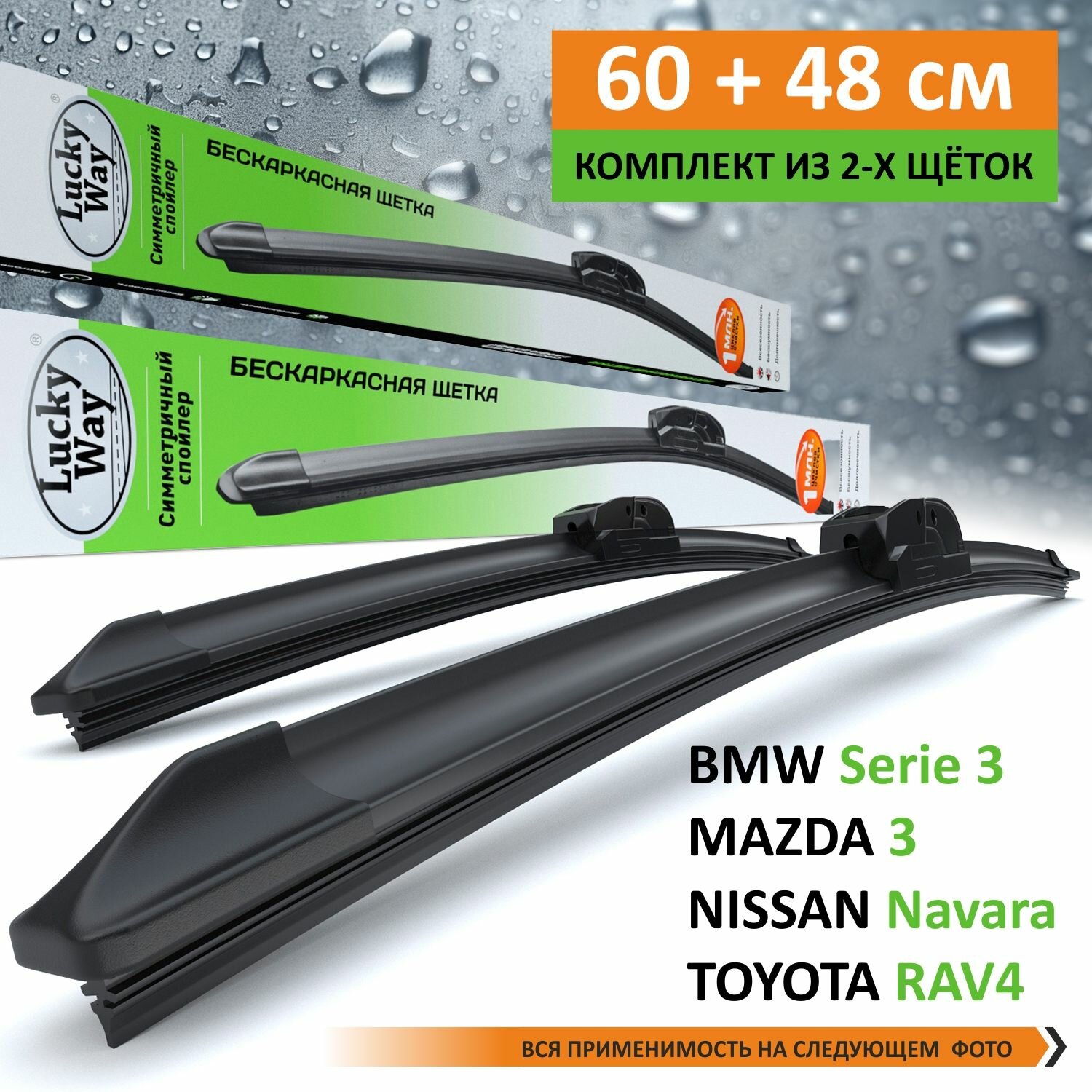 2 щётки стеклоочистителя LuckyWay (60см+48см) BMW Serie 3 (98-05); MAZDA 3 (08-13); NISSAN Navara (05-15); TOYOTA RAV4 (00-06); OPEL Omega (93-03)