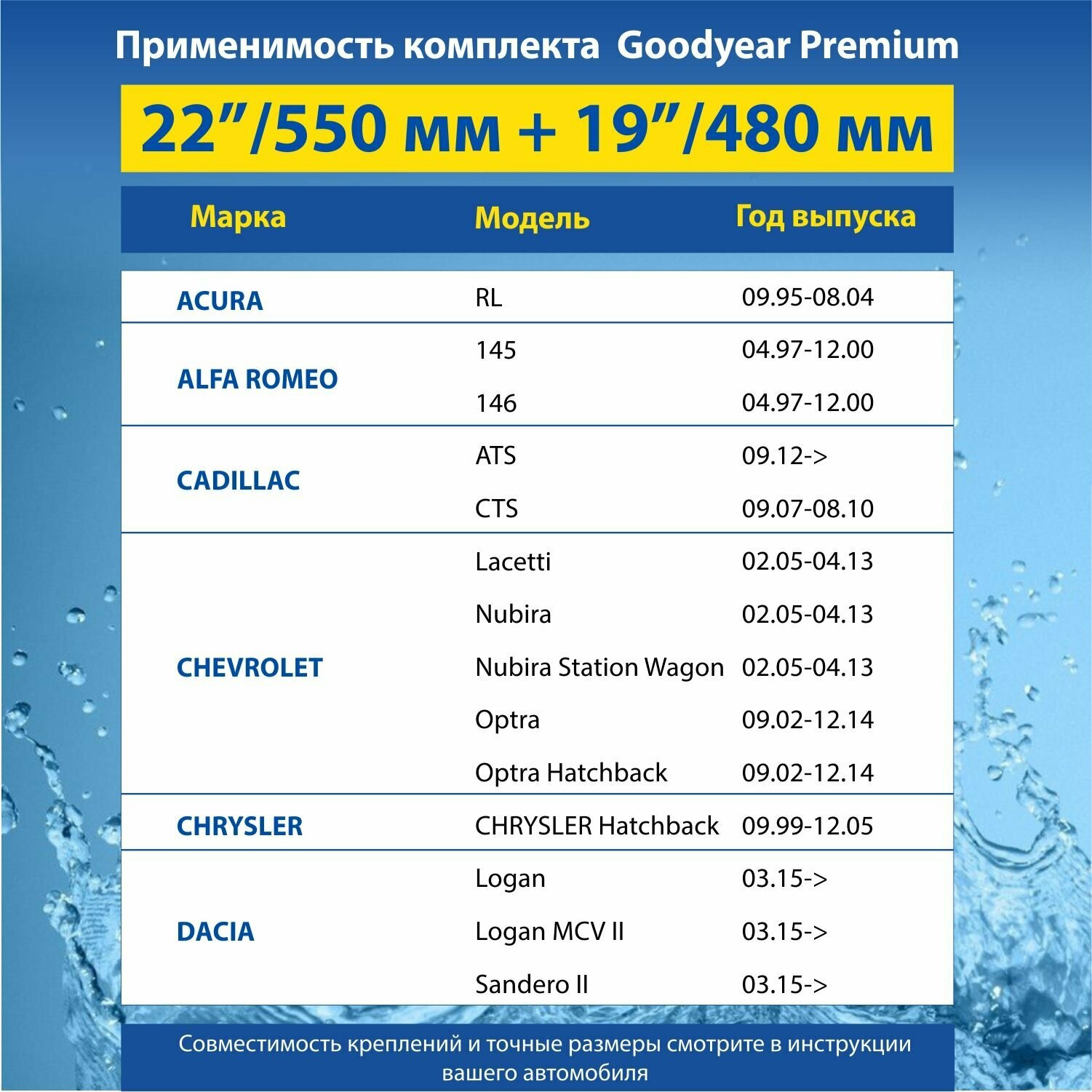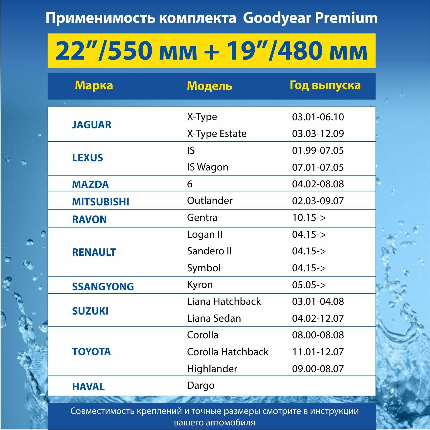 2 Щетки стеклоочистителя в комплекте (55+48 см), Дворники для автомобиля GOODYEAR для RENAULT Logan II 15-нв, Sandero II 15-нв, MAZDA 6 02-08, TOYOTA Corolla 00-08 информация: